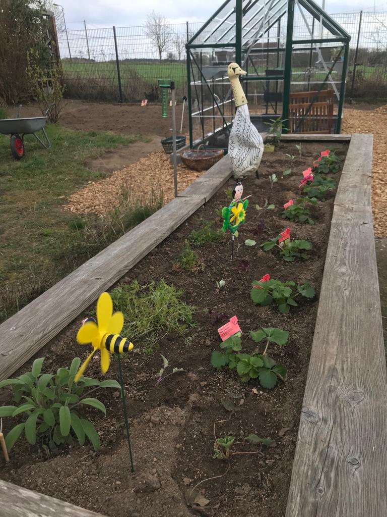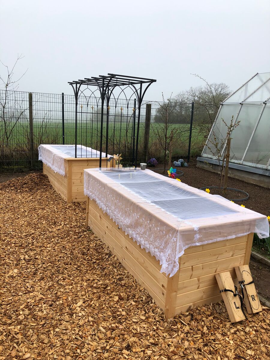 Meine ausrangierten Wohnzimmergardinen wurden kurzerhand zum Saatschutz umfunktioniert. Inzwischen hat mein Bruder mir große Kästen gebaut und wir haben Fliegengitter an getackert. Aber ehrlich, die Gardinen sahen optisch doch viel schöner aus, oder?