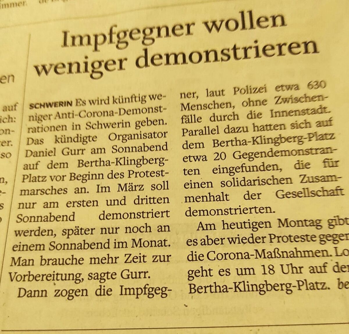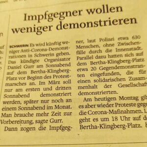 Sofort nach den Berichten in der Presse und im Fernsehen habe ich dies sowohl Frau Schwesig, als auch der SVZ und dem NDR versucht zu erklären. Erfolglos. Der Artikel in der SVZ vom 13.12.2021 machte mir Hoffnung. Doch heute am 14.02.2022 ist diese Hoffnung dahin. Die Impfgegner wollen weniger demonstrieren, steht heute in der Zeitung. aber auch, dass die 20 Teilnehmer der Antifa für einen solidarischen Zusammenhalt der Gesellschaft demonstrierten. Eine Frau Birgit G. musste mit dem RTW in die Klinik und wurde durch die Demo aufgehalten; nach dem Mord an den zwei Polizisten tat die Polizei schweren Herzens ihren Dienst, um mich und die anderen Spaziergänger zu bewachen.