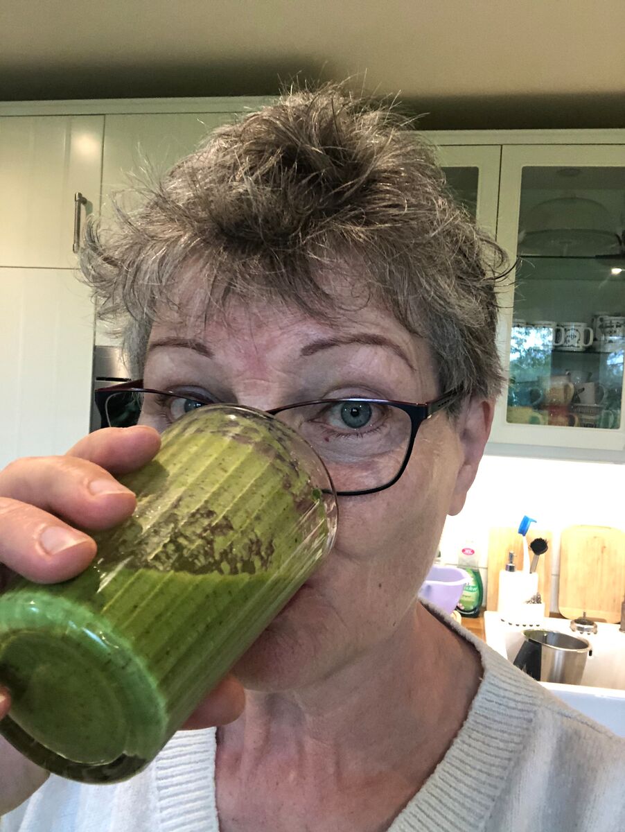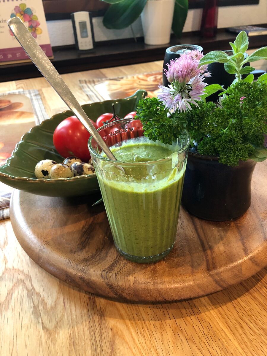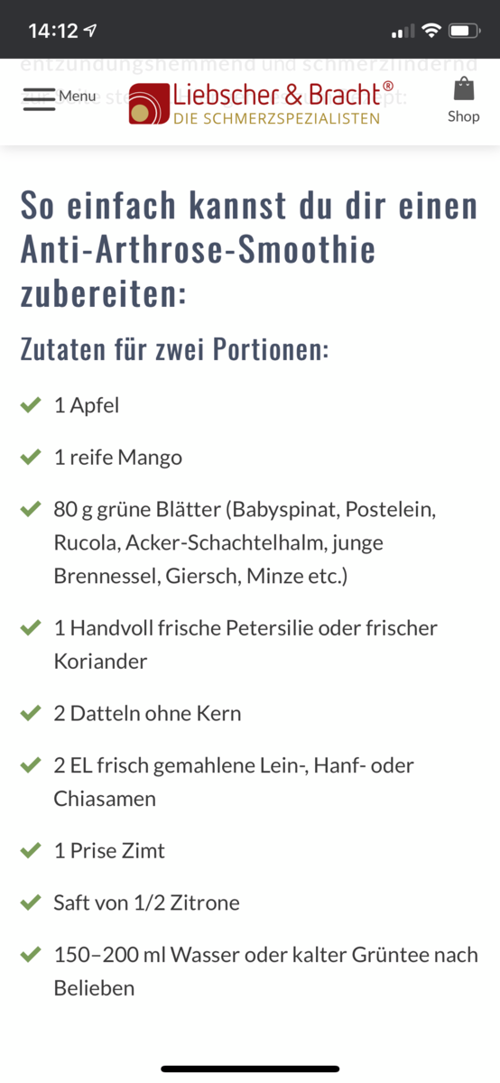 Zwei Tage habe ich gebraucht um mich dazu durchzuringen diese Zutaten in meinen Thermomix zu einem Smoothie zu verarbeiten. Erst schaute ich noch skeptisch in den Topf und rümpfte die Nase angesichts der grünen Pampe. Ziemlich dickflüssig kam die Masse in ein Trinkglas und siehe da, es schmeckte. Mit Genuss habe ich das zähflüssige Getränk verzehrt und warte nun auf die Wirkung. Da ja gegen jede Krankheit bekanntlich ein Kraut gewachsen ist, sind bei Arthrose gleich 10 Kräuter. Wenn das nicht hilft, was dann.