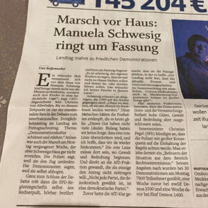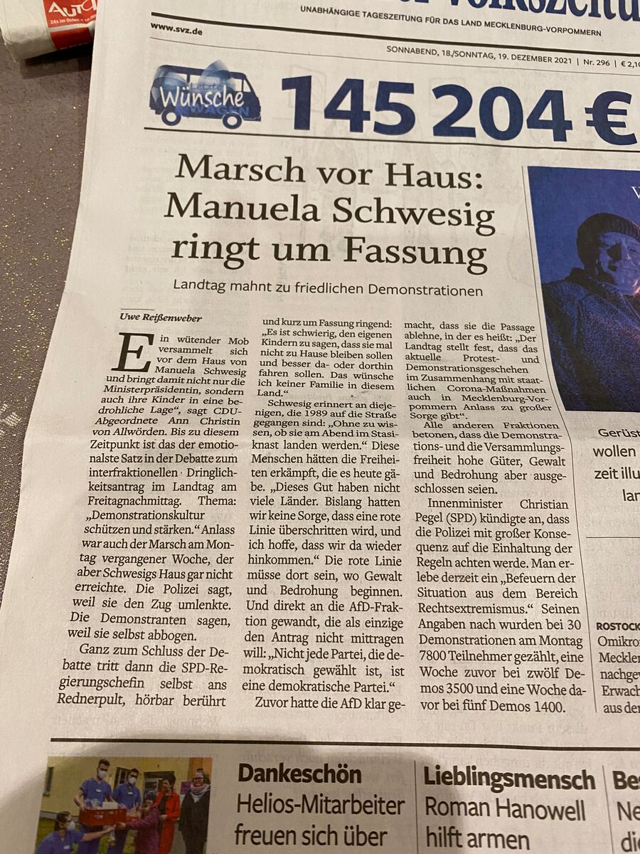 In der Debatte des Landtages zu den Demonstrationen in Schwerin, hatte Frau von Allwörden keine Bedenken, erneut die Stimmung gegen den wütenden Mob, der am 06.12.21 vor das Wohnhaus von Manuela Schwesig zog, anzuheizen. Die SVZ gibt dem Ganzen noch die richtige Überschrift und schon ist das angebliche Feindbild massiv befeuert.
